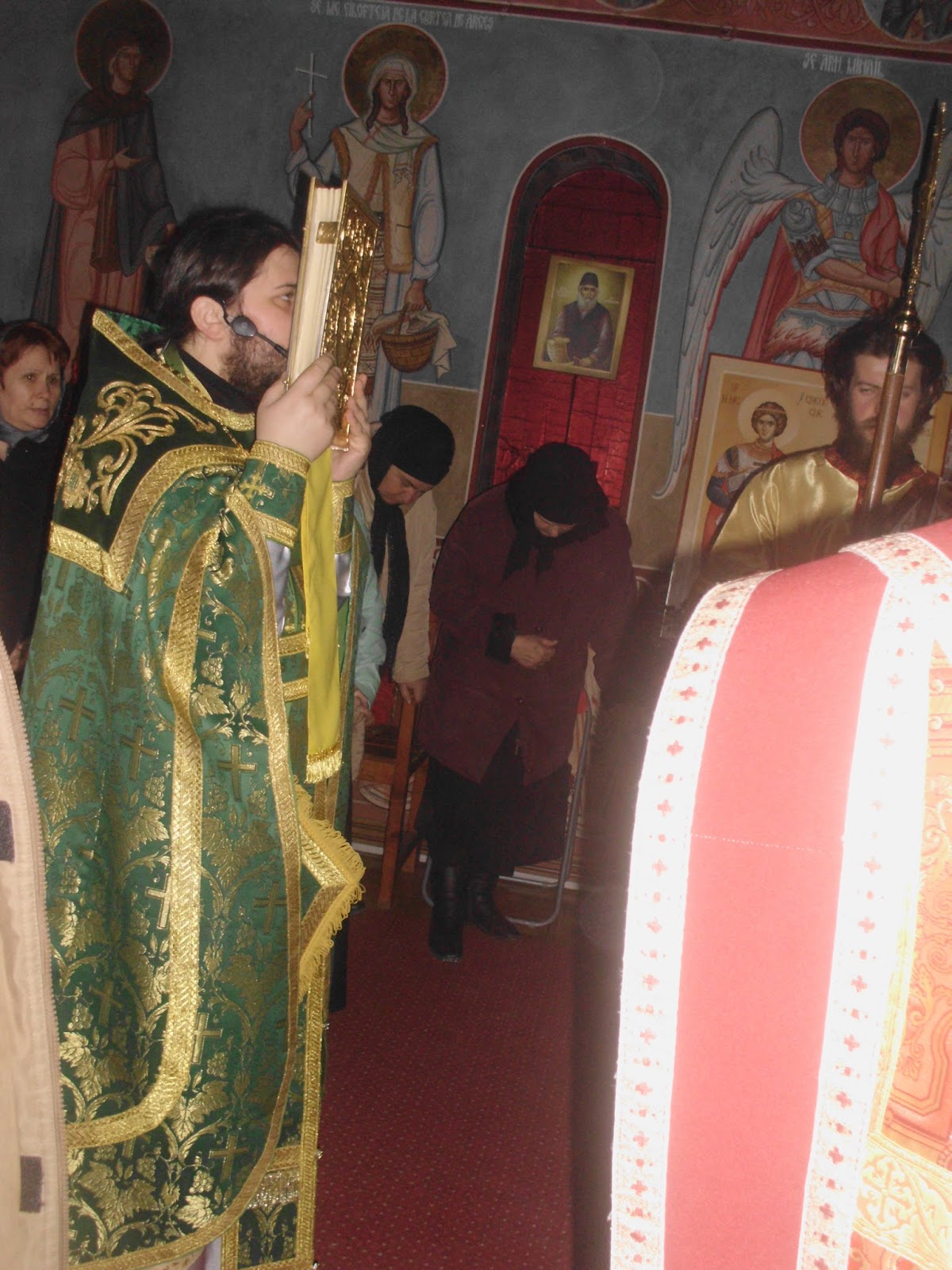 vesmintele bisericii se schimba in timp ce Parintele isi continua cantarea si isi schimba vesmantul ...cele luminoase sunt stranse si in locul lor se pun vesmintele mov...